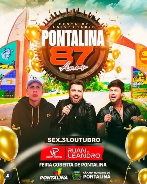 A cidade está em festa! São 87 anos de história, alegria e tradição, e você é nosso convidado especial pra comemorar em grande estilo! Show com Ruan & Leandro, DJ Vinícius Pimentel – Feira Coberta – Pontalina-Go
