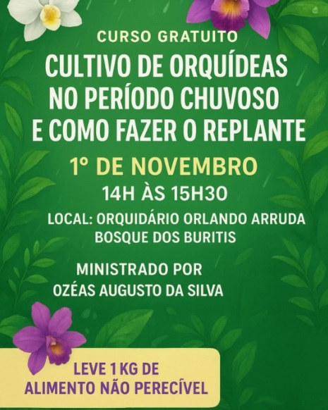 No dia 1º de novembro, venha participar do curso gratuito sobre cultivo de orquídeas no período chuvoso e como fazer o replante, com o orquidófilo Ozéas Augusto da Silva, da Associação Goiana de Orquidófilos. Orquidário Orlando Arruda – Bosque dos Buritis, Goiânia