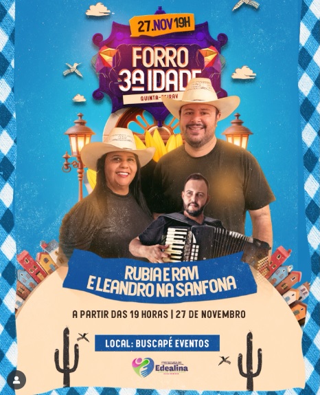 27/11/2025: A Prefeitura de Edealina-Go convida você para mais uma edição do Forró da 3ª Idade! Rubia e Ravi e Leandro na Sanfona, Buscapé Eventos,a partir das 19 horas.