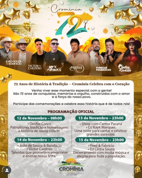 12 à 15/11/2025: Aniversário de Emancipação Política 72 Anos de Cromínia-Go com Desfile e Shows.