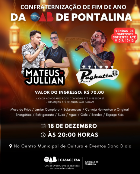 18/12/2025: A Ordem dos Advogados do Brasil – Subseção de Pontalina, com o apoio da CASAG, convida você para um jantar especial de confraternização em comemoração às festas de fim de ano! – Centro Municipal de Cultura e Eventos Dona Diola – Pontalina-Go (Cada advogado(a) pode adquirir até 5 ingressos.)