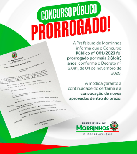 A Prefeitura de Morrinhos-Go prorrogou por mais dois anos a validade do Concurso Público nº 001/2023, reafirmando o compromisso com a transparência, a legalidade e a valorização dos servidores municipais.