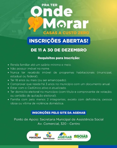 Atenção Pontalina! As inscrições para o programa Pra Ter Onde Morar – Construção já estão abertas em Pontalina-Go! De 11 a 30 de dezembro, moradores que se enquadram nos critérios…