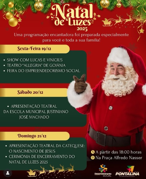 19/12/2025 Sexta-Feira – Natal de Luzes 2025: Show com Lucas e Vinícius; Apresentação do Teatro “Alegria”, de Goiânia; Feira do Empreendedorismo Social, na Praça Alfredo Nasser, Centro – Pontalina-Go