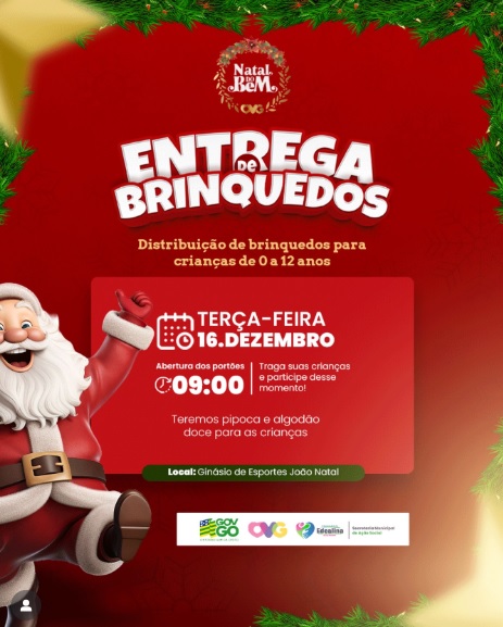 Na próxima terça-feira, 16 de dezembro, teremos a Entrega de Brinquedos para crianças de 0 a 12 anos. Os portões abrem às 09h, no Ginásio de Esportes João Natal, em Edealina-Go