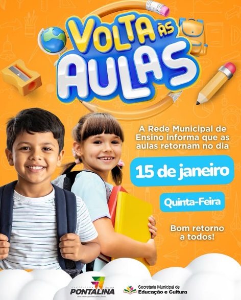 A Prefeitura de Pontalina, por meio da Secretaria Municipal de Educação e Cultura, informa à comunidade escolar que as aulas da Rede Municipal de Ensino retornaram no dia 15 de janeiro (quinta-feira).