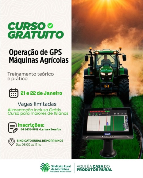 21 e 22/01/2026: Sindicato Rural de Morrinhos-Go – Curso Gratuito de Operação de GPS em Máquinas Agrícolas!